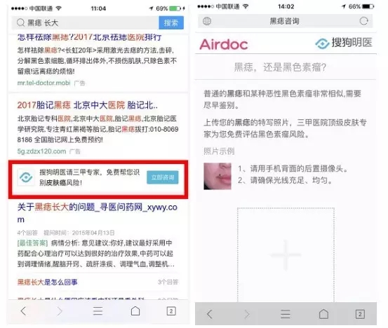 国内有搜狗明医结合AI技术,推出黑色素瘤人工智能识别服务,用户只需上传图片即可自动分析诊断黑色素瘤。